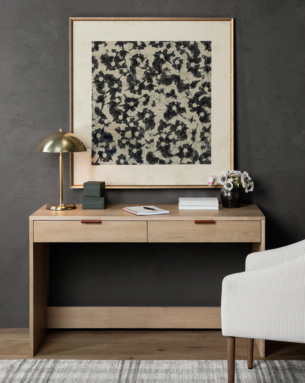 The Aldorno Desk Table Lamp strikes a balance between pronounced lines and elegant curvature. Crafted from brass, the table lamp makes a soft statement in lighting designs from the office to the living room. A wide round shade brings a nuanced shapeliness and classic feel to its simple form.