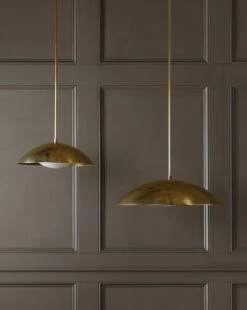 The Aldorno Pendant strikes a balance between pronounced lines and elegant curvature. Crafted from brass, the pendant makes a soft statement in lighting designs from the dining room to the living room. A wide round shade brings a nuanced shapeliness and classic feel to its simple form.