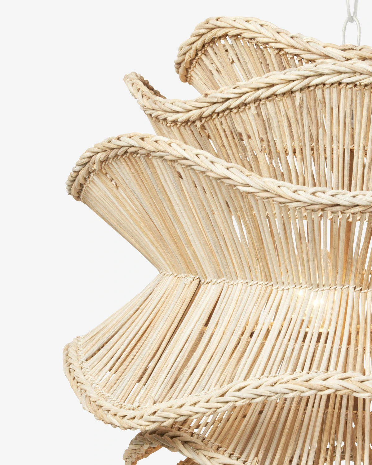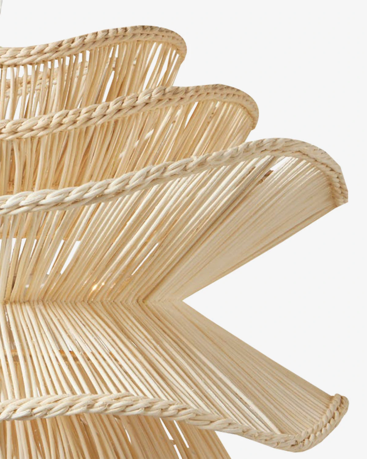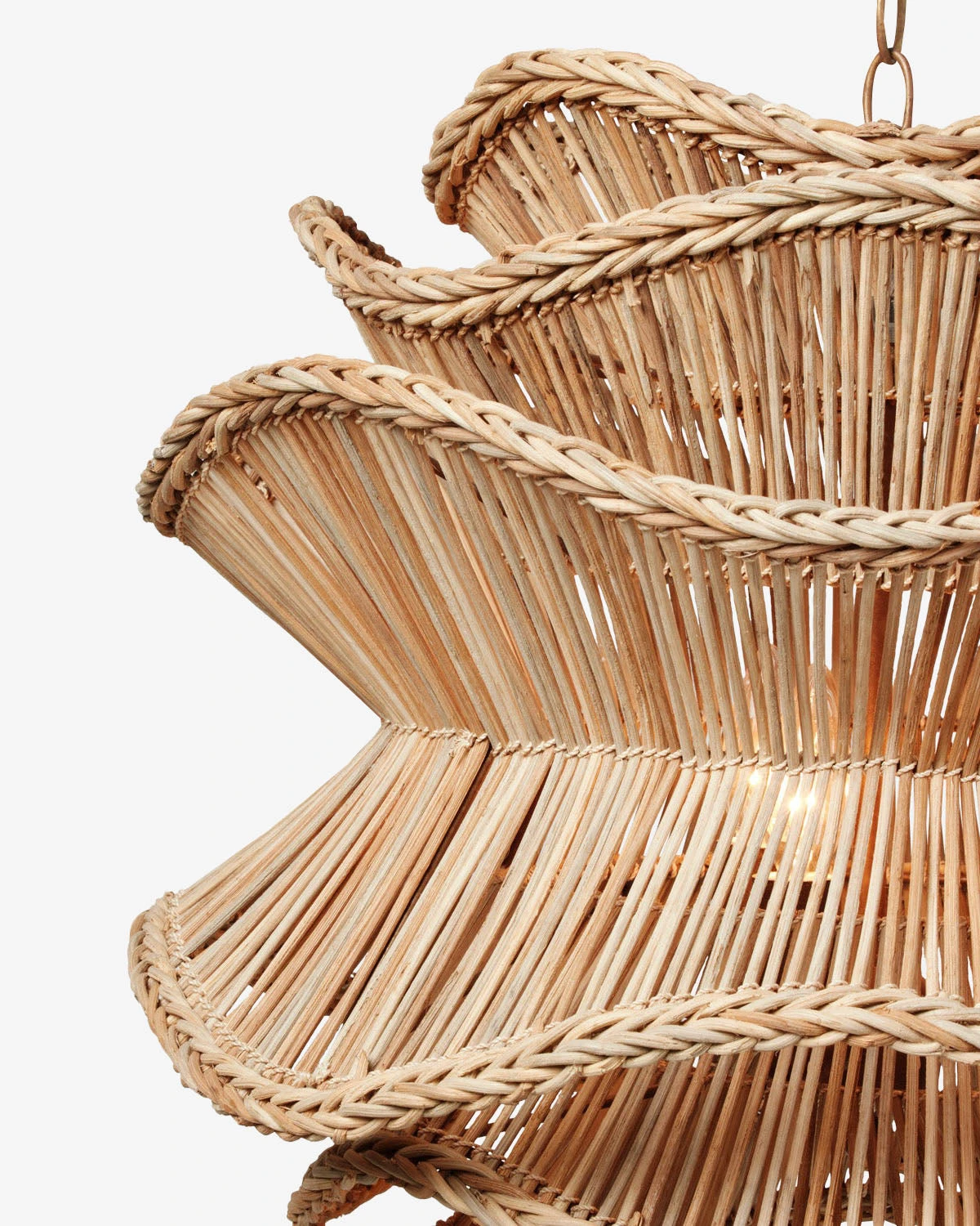 A sculptural nod to natural materials, the Alondra Chandelier is a statement-making centerpiece. Its abstract design is inspired by the lacy nature of graceful flower petals, creating an organic feel that layers and flows from one tier to the next. The edges are densely braided from rattan, connecting the intentionally placed reeds of the same material. Available in three finishes and a variety of sizes, this piece brings nature into the home.