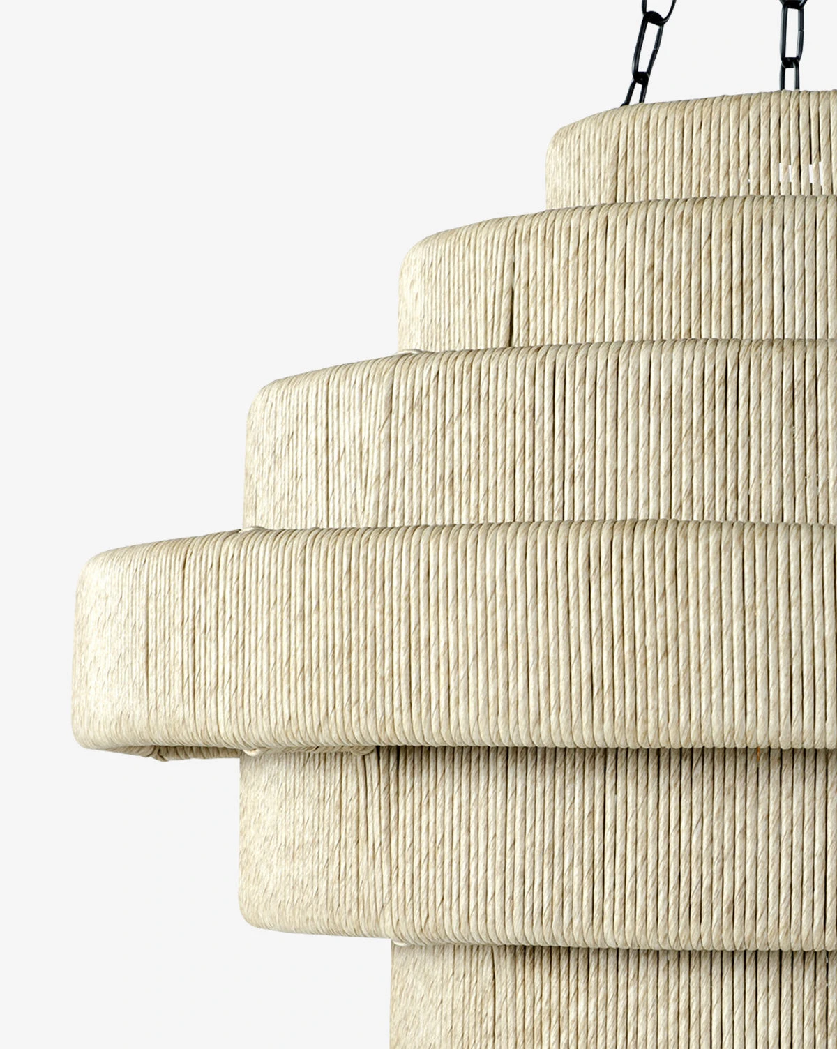 Striking and geometric, the Everly Outdoor Pendant is also intricately textural. It is crafted from all-weather synthetic wicker in an oatmeal tone, finely woven over a metal frame. Providing a refined balance to the organic feel of the pendant, the chain is finished in matte black.