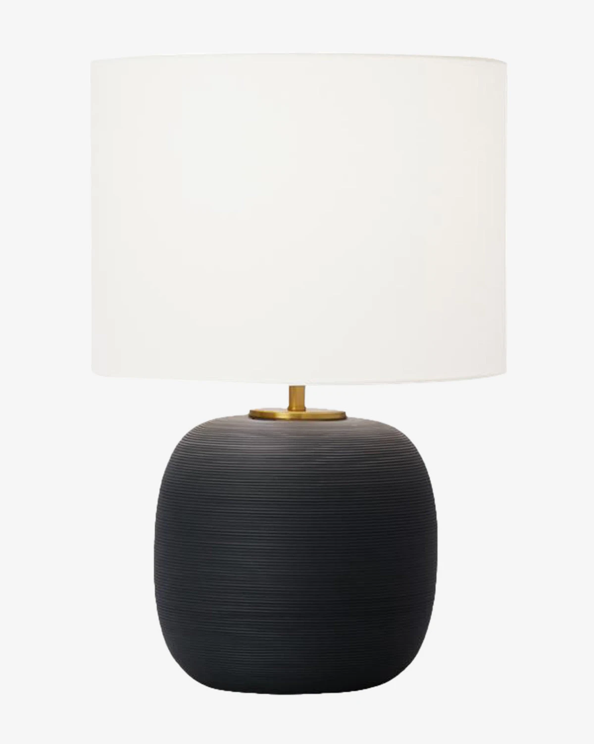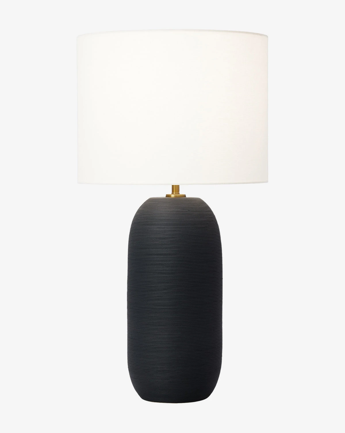 A textural, round base brings depth and artistry to your space with the Fanny Table Lamp. Crafted from ceramic with a rough black finish, the lamp presents itself with balance and contrast with a white linen shade.