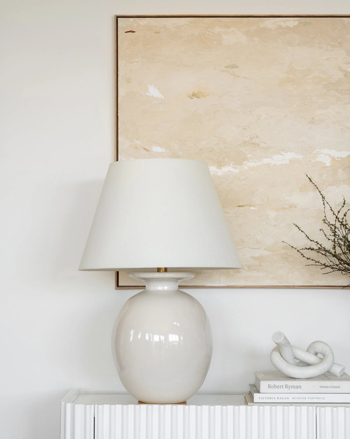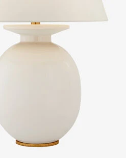 Modifying the classic vase structure with more pronounced angles, the Hans Table Lamp feels effortlessly simple. Its smooth surface is created with reactive glaze, which gives subtle variation to each piece, and is carefully accented with gold detail. Elegantly simple, this table lamp is versatile and sure to become a staple piece in your living spaces.