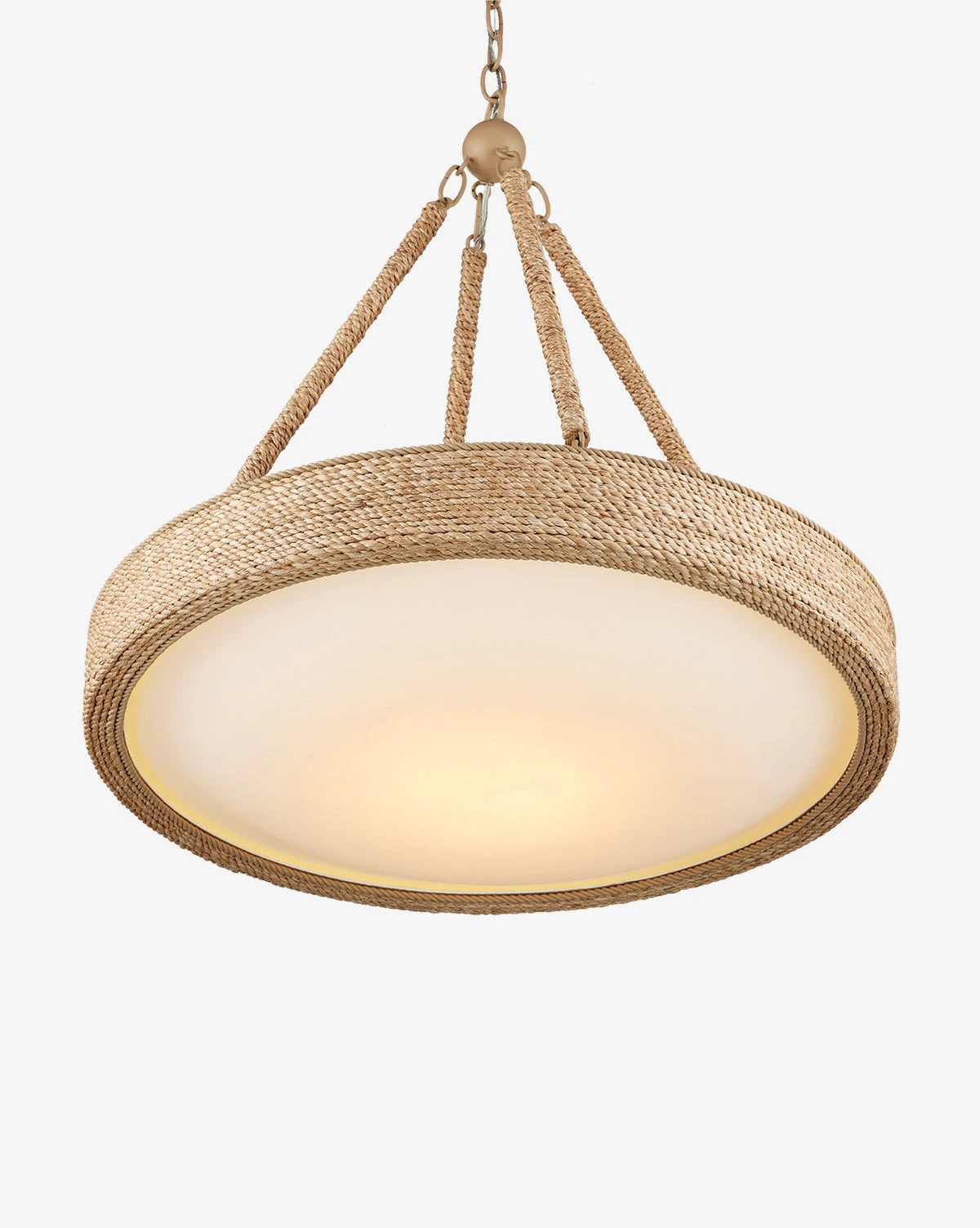 Featuring a streamlined yet organic design and a frame wrapped in natural abaca rope, the Hopscotch Chandelier brings warm light to any room. Displaying a wide glass shade, this chandelier is beautifully balanced.