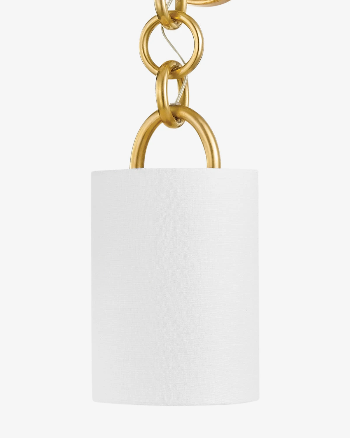 In an elegant design, the Kansa Wall Sconce blends traditional materials with a contemporary feel. Its white linen shade is suspended by a short brass chain, complementing the round backplate and exaggerated brass hook on the shade. With a seamless mix of materials, this sconce brings warm light to any room.