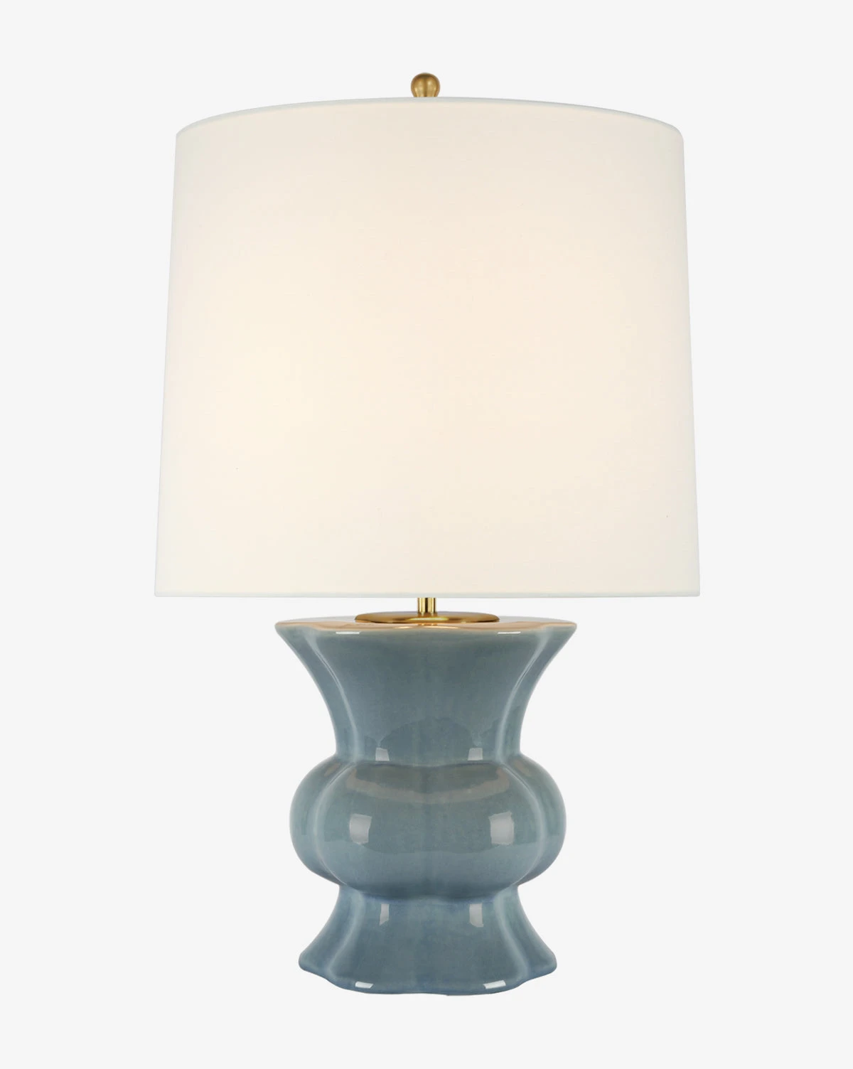 Artistic and vase-like, the Lavinia Table Lamp mixes glazed ceramic with a large linen shade. Its shapely base brings a classic decorative feel to a console or tabletop. Playing with scale, the large linen shade prioritizes illumination alongside the lampโs bold style.