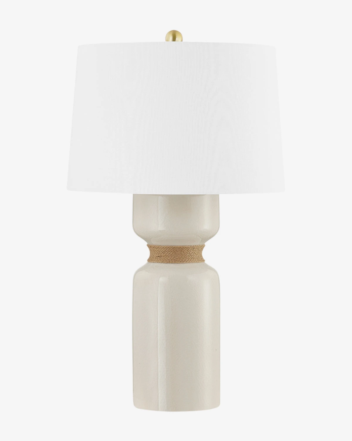With a masterfully designed ceramic base, the Mindy Table Lamp is both sleek and sculptural. Its tapered white base is complemented by wrapped rope in the center while the linen shade features an aged brass finial, adding a unique mix of materials to your decor.