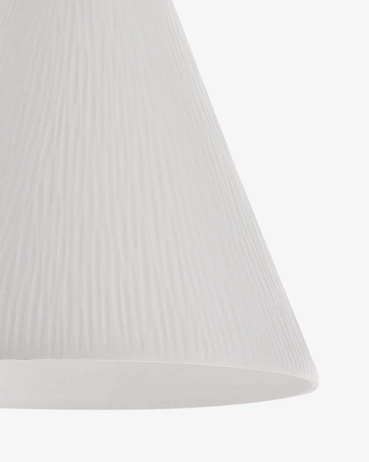 With a conical porcelain shade, the Oakland Pendant brings unique materials to traditional lighting. When illuminated, the pendant highlights the chiseled texture of the shade, adding depth to its clean aesthetic. An antique brass steel link chain brings contrast and warmth to the matte bone porcelain.
