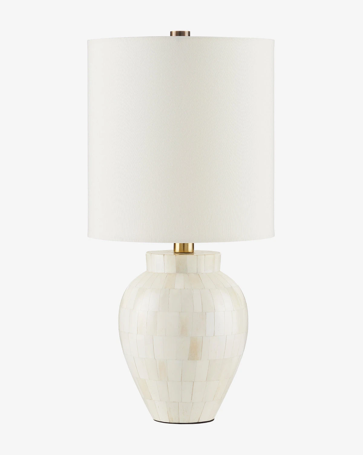 Handcrafted in India from wood and ivory, the Osso Round Table Lamp is petite in size but large in impact. The body of the lamp is an urn-shaped form clad in a bone-on-bone inlay with a finial accent and a white shade that adds a soft, luxurious feel to this textural, organic design. Each bone is cut by hand to give the piece its seamless feel, creating a unique look that can’t be replicated.