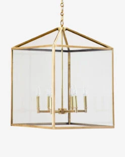 A small industrial chandelier placed inside a traditional lantern silhouette, the Pietro Lantern is both bold and delicate. The brass frame makes a simple metallic statement in lighting designs from a kitchen to living room, and its thoughtful brass chain and collection of shapes create a beautifully holistic piece.