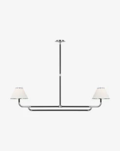 With a modern silhouette, the Rigby Linear Chandelier brings simplicity to your decor with a unique mix of materials. The white linen fabric shades are accented by wood arms that contrast the metal structure in two bold finishes.