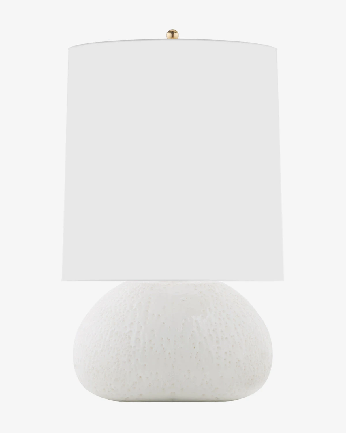 The Sumava Table Lamp features a stout textural ceramic base, and elongated linen shade providing an eye-catching reversal of authentic shapes. Finished in a creamy white hue, and topped with a gold finial, this lamp exudes elegance and femininity wherever itโs placed.